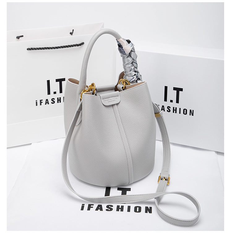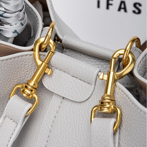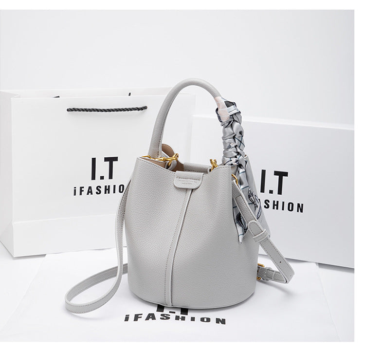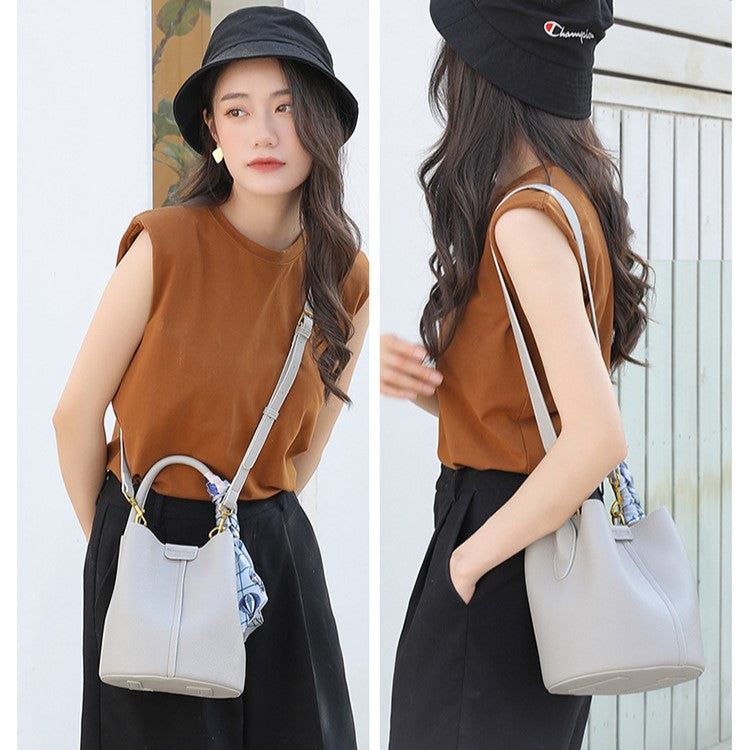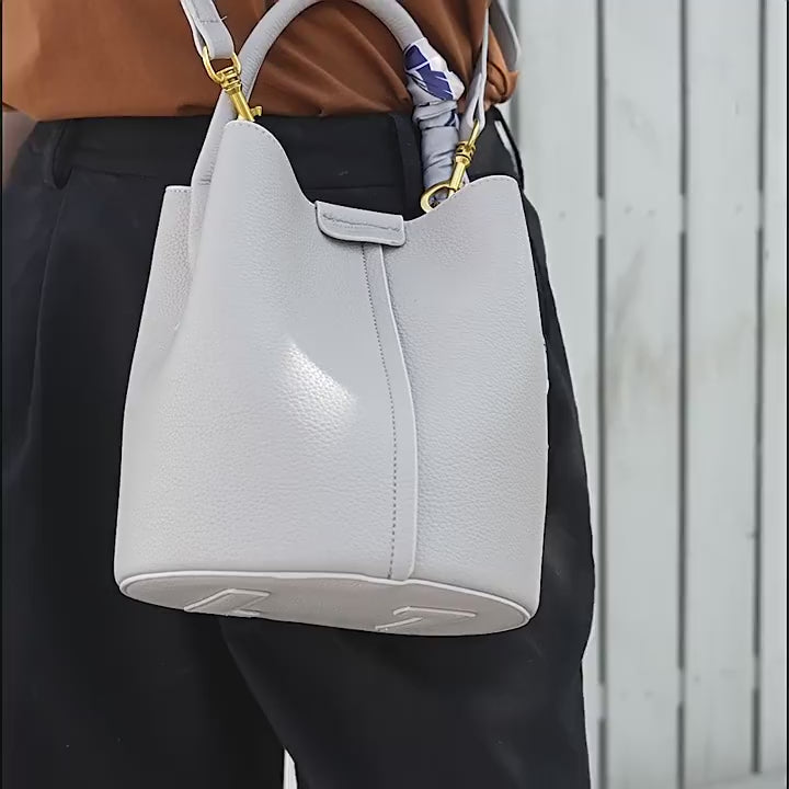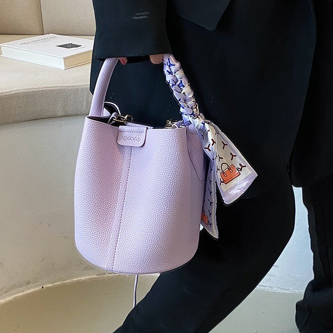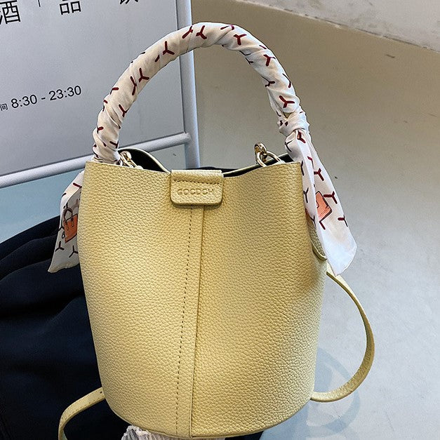 Add a pop of color and elegance to your wardrobe with The Bella Bucket – a modern twist on the classic bucket bag. Crafted from high-quality textured vegan leather, this structured silhouette features a softly rounded base and a sturdy top handle wrapped in a chic patterned scarf for a luxe finishing touch.